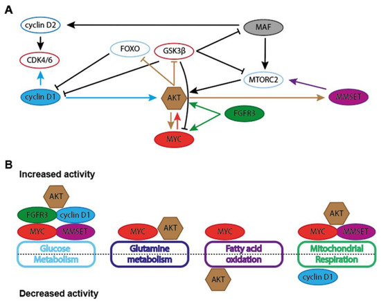 MM cases that carry MAF translocations share a distinct gene expression signature that is similar between different MAF proteins [115,279]. In a cohort of 1273 newly diagnosed patients, the t(14;16) translocation was associated with mutations BRAF, TRAF2 and DIS3 (mutations that affect MAPK-signaling, NFKB signaling and exosome formation), deletion of 13q, gain of 1q and the aforementioned APOBEC signature [115]. Genes strongly associated with MAF overexpression in MM include CCND2, integrin-β7 (ITGB7), C-C chemokine receptor-1 (CCR1) [266,280], AMPK-related protein kinase 5 (ARK5) [281] and DEPTOR [268]. MAF can therefore directly regulate proteins involved in cell cycle regulation (CCND2), MM cell homing, migration and adhesion (ITGB7, CCR1), insulin growth Factor-1 (IGF1) mediated invasion (ARK5) and PI3K/AKT/mTORC signaling (DEPTOR) (Figure 3). This suggests a potentially multifaceted role for MAF family members in metabolic control.