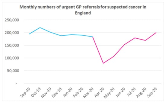 From the outset, cancer patients were identified as being more vulnerable to the virus so were placed on the list of people asked to shield at home. This was entirely reasonable, given that cancer patients are often treated with chemotherapy with recognised myelosuppressive effects [1]. Early data from China supported this notion [1,2]. The National Clinical Research Center for Respiratory Disease in conjunction with the National Health Commission of the People’s Republic of China published a nationwide review of 1590 people infected with COVID-19, which revealed that cancer patients, who made up (1%) of the prospectively analysed cohort, were more likely to have a severe event, HR 5.34, 95% CI 1.8–16.18. Cancer patients (n = 28), who had received their last systemic anticancer treatment (SACT) within 14 days had increased risk of developing severe events (HR = 4.08, 95% CI 1.09–15.32) [3]. A severe event was defined as admission to an Intensive Care Unit (ICU), requiring ventilation and death. Time to deterioration was more rapid in cancer patients compared to non-cancer patients, median 13 days; however, this was a non-specific and underpowered study. Numerous other descriptive or retrospective clinical studies examining patient outcomes in China, from the onset of the pandemic, suggested that age and medical co-morbidities, including cancer, increased the risk of Sars-Cov-2 virus infection [1,2,4] and, in severe cases, death resulted from multiorgan failure and acute respiratory distress syndrome [4,5,6]. The first national lockdown in the UK commenced on 23rd March 2020, with the aim of saving lives by ensuring the National Health Service (NHS) was not overwhelmed by the burden of treating uncontrolled numbers of patients infected with COVID-19. The immediate focus was to treat infected patients; clinical presentation varying from those suffering cough and fever, to patients needing hospital admission for oxygen therapy, up to the sickest patients who required admission to ICU for ventilation. As a result, hospital services and staff were redeployed with the principal aim of improving ICU capacity in order to meet the unprecedented demands. Non-emergency clinical services, including diagnostics and elective surgery, were de-prioritised, an inevitable consequence of which was compromised cancer care [7,8]. Simultaneously, population isolation, shielding and lockdowns have had a considerable impact on the numbers of patients presenting with symptoms. Subsequently, there has been a massive fall in referrals of symptomatic patients from primary into secondary care [7]. Figure 1 demonstrates the descent in referrals from primary to secondary care for all cancers at the height of the pandemic.