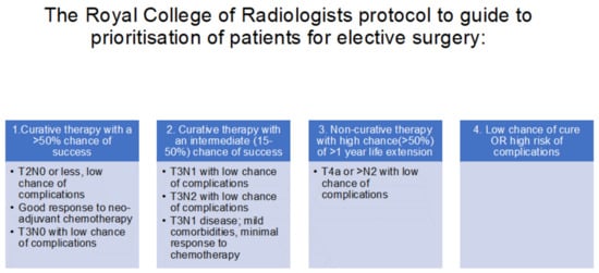 New patient pathways were mandated in order to be able to deliver cancer care safely during the ongoing pandemic. At the start of the pandemic, the risks of operating were not known [12]. The Royal College of Radiologists published a document on 25 March 2020 entitled “Considerations for treatment of oesophagogastric cancers within the United Kingdom during the Covid-19 pandemic”. The treatment advice document was devised after seeking the expert opinion of cancer specialists. Prioritisation protocols were developed and published to guide the prioritisation of elective surgery. They were divided into four categories (Figure 2):