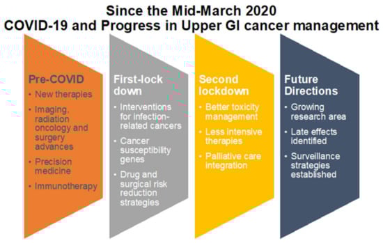 Coronavirus disease 2019 (COVID-19), caused by the novel, severe acute respiratory syndrome coronavirus 2 (SARS-CoV-2) virus, has left dramatic footprints on human health and economy. Cancer, whilst not an infective disease, is prevalent in epidemic proportions and cannot be pretermitted due to the impact of COVID-19. As we emanate from the second national lockdown in the UK with mixed feelings of hope and despair—due to vaccination and new COVID-19 variant, respectively—we reflect on the impact of the first wave on the provision on diagnosis and management of with upper gastrointestinal (UGI) cancers. This review provides a critical analysis of available literature on COVID-19 and its impact on cancer management in general and that of UGI cancers in particular.