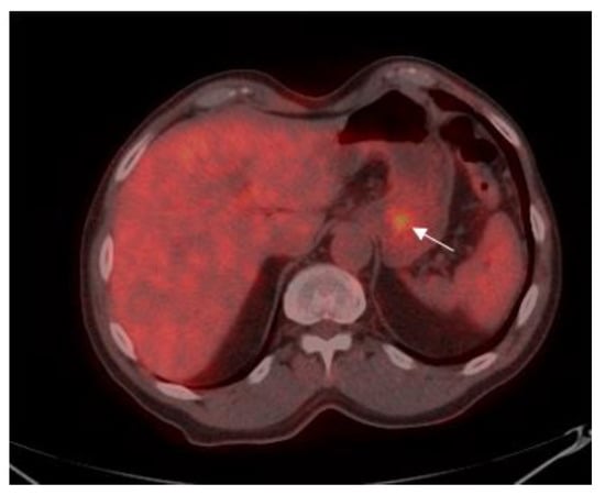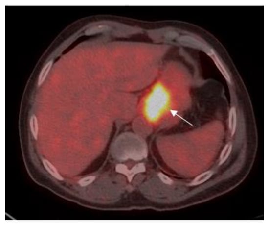 A 70-year old male with gastric adenocarcinoma (SRCC). Axial PET-CT images show low 18F-fluorine-18 fluoro-2-deoxy-D-glucose (FDG) uptake (standardized uptake value (SUV)max: 16.2) in primary tumor in the body of the stomach (white arrow).