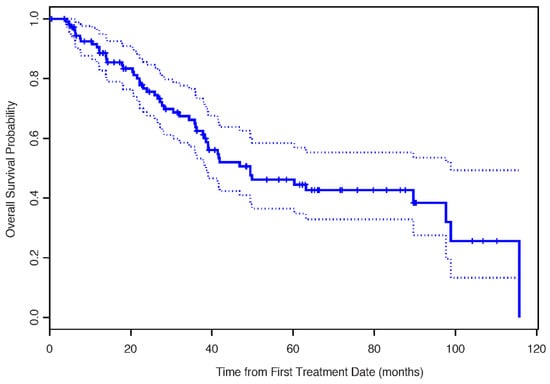 The median OS for the entire cohort was 49.5 months (95% CI: 38.5–98.8 months) Figure 3.