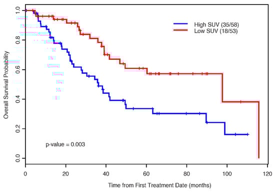 The median OS for the low-SUV group was 98.0 months (95% CI: 49.5, not estimable (NE) months) and that for the high-SUV group was only 36.0 months (p = 0.003) (Figure 4).