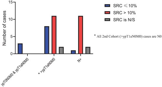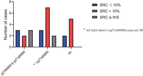The median DFS for the entire cohort was 38.2 months (95% CI: 27.7–97.6 months) The median DFS for the low-SUV group was 98.0 months (95% CI: 36.9–NE months) compared to only 27.0 months (95% CI: 15.2–63.2 months) for the high-SUV group (p value = 0.005). Of the 100 patients with SRCs in untreated samples, 48 patients were in the low-SUV group and 52 patients were in the high-SUV group. Post-treatment pathological specimens were assessed for SRC enrichment. Thirty (62.5%) patients in the low-SUV group and 29 (55.76%) patients in the high-SUV group had persistent SRCs. Further analysis of post-treatment SRC in the low-SUV group based on AJCC 8th edition [26] showed that a higher SRC percentage was noted when the stage (ypTNM) was higher than ypT1N0M0 and when there was regional lymph node(s) metastasis compared to the ypT0N0M0 and ypT1aN0M0 groups (Figure 5). The findings were the same for the high-SUV group (Figure 6). Only four (3.6%) patients achieved a pCR. One (1.9) pCR patient was in the low SUV group and three (5.3%) were in the high SUV group (not significant).