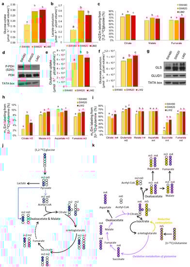 Analysing metabolic differences between the cell lines, we demonstrated that the metastatic cell lines (SW620 and LiM2) had a stronger Warburg effect than SW480, as they consumed more glucose and produced more lactate (Figure 2a,b). Subsequent analysis of glucose entrance into the tricarboxylic acid (TCA) cycle, evaluated by [1,2-13C]-glucose incubation, indicated a higher glucose contribution into the TCA in the metastatic cell lines (Figure 2c,j). Consistent with this result the levels of phosphorylated pyruvate dehydrogenase (PDH) were decreased in metastatic cells (Figure 2d and Figure S2a) indicating its higher activity.