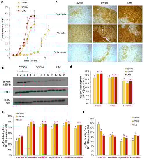 The metabolic adaptation of the metastatic cell lines observed in vitro is maintained in an in vivo scenario. (a) Tumour volume evolution measured by calliper. (b) Immunohistochemical staining of paraffin-embedded tumour slides (40×). (c) P-PDH (phosphorylated pyruvate dehydrogenase at S293) and PDH (total pyruvate dehydrogenase) protein levels tested by western blotting of tumour extracts. TATA box was used as a loading control. Samples 1–14 indicate extracts from different mice that were injected with SW480 (1–4), SW620 (5–10) or LiM2 (11–14). (d) Glucose contribution to TCA cycle measured from a tumour extract after a 15-min bolus of [U-13C]-glucose (20 mg/35 g) before the mice were culled. (e) and (f) Glutamine contribution to TCA cycle measured from a tumour extract after two boluses of [U-13C]-glutamine (6 mg/35 g, with 15 min interval) before the mice were culled, representing (e) oxidative metabolism of glutamine and (f) reductive carboxylation. a,b,c A one-way ANOVA and Scheffe’s test for multiple comparisons was performed for the factor “cell line”.