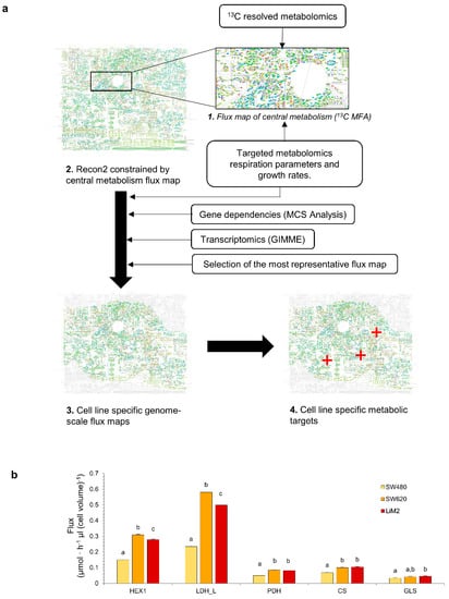 Computational inference of cell line-specific metabolic flux maps and metabolic targets through multiomics data integration. (a) Graphical representation of the multiomics integration workflow. First, a central carbon metabolism flux map is estimated using 13C MFA, next the flux map is used to constrain the generic human GSMM Recon2, then several layers of omics data are used to estimate the cell line specific flux maps which can be used to identify metabolic vulnerabilities to selectively target specific populations. (b) Predicted Fluxes through HEX1 (hexokinase), LDH-L (lactate dehydrogenase), PDH (pyruvate dehydrogenase), CS (citrate synthase) and GLS (glutaminase). a–c denote cell lines with an overlap of the sampled flux values for a given reaction.