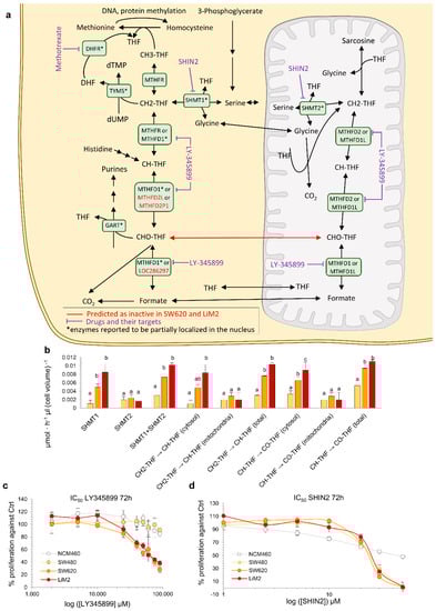 Our model predicted that the SW620 and LiM2 cell lines displayed significantly higher fluxes through the cytosolic folate pathway and were thus vulnerable to the inhibition of the cytosolic enzyme MTHFD1 (Table 1), which catalyses several steps of the cytosolic folate pathway (Figure 6a,b). The model specifically identified that, in the metastatic cell lines, the inhibition of the cytosolic folate pathway could not be compensated by the generally redundant folate mitochondrial pathway, because the CHO-THF generated by the mitochondrial isoenzyme (MTHFD2) could not be transported to the cytosol to compensate for MTHFD1 deficiency (Figure 6a). Therefore, in the metastatic cell lines, folate metabolism was, to some extent, uncoupled between the cytosol and the mitochondrial matrix, which would render them vulnerable to cytosolic folate pathway inhibitors.