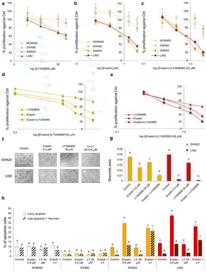 The results showed that the combination of erastin and LY345899 synergistically affected the proliferation of the metastatic cell lines from concentrations of 0.5 μM of erastin and 20 μM of LY345899 (Figure 7a–e and Table S4). In line with this, the 3D growth of the SW620 cell line was significantly more impaired by the drugs in combination than with individual treatments. However, no differences were observed on spheroid formation in LiM2 cells between the combination and erastin individually due to the pronounced effect of the erastin treatment (Figure 7f,g). Additionally, the metastatic cell lines presented higher fractions of late apoptosis and necrosis with the combined drug treatment, but lower early apoptosis in comparison with erastin alone (Figure 7h).