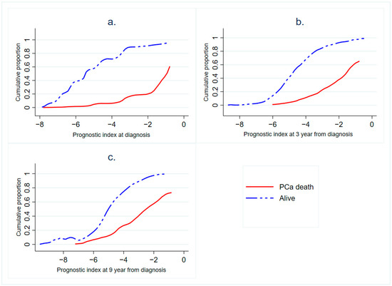 Cumulative distribution of prognostic index (PI) values for men who died due to prostate cancer (PCa) and those who did not during (a) the development period of 0–3 year (b) the development period of 3–9 years and (c) the development period of 9–20 years. The distribution of men is described as a cumulative frequency across values of the PI from low (indicating worse survival) to high (indicating favorable survival).
