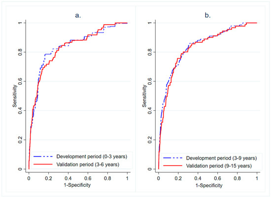 (a) Receiver operating characteristic (ROC) curves for the development period of 0–3 year and validation period of 3–6 years and the (b) development period of 3–9 years and validation period of 9–15 years.