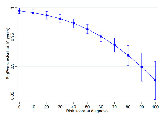 The simplified risk score at diagnosis (Table 3) was used to calculate the predicted PCa survival at 10 years (Figure 3). Overall, men with a high-risk score at diagnosis had poorer survival.