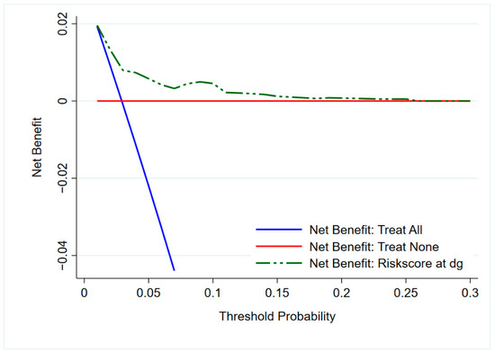 Decision curve analysis shows the benefit of use of the prediction model (simplified risk score at diagnosis). A net benefit was found for a reasonable range of 3–25%: the curve diverged only at the threshold probability of about 3%.