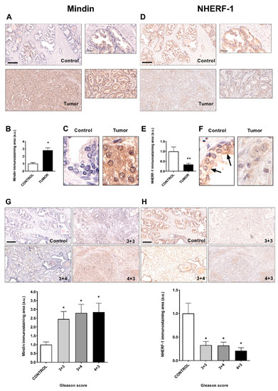 Human prostate tumors classified according to Gleason score show increased levels of MINDIN and decreased Na+/H+ exchanger regulatory factor 1 (NHERF-1) immunolabeling. Evaluation of MINDIN and NHERF-1 immunolabeling levels was performed in human control and prostate tumor samples by immunohistochemistry. Representative images, bar graph and detailed images of MINDIN (A–C) and NHERF-1 (D–F) immunostaining levels in control and tumor samples are shown. Representative images and evaluation of MINDIN (G) and NHERF-1 (H) immunostaining levels according to Gleason score classification are shown. Black arrows indicate apical NHERF-1 immunostaining. Black and grey scale bars represent 500 and 100 µm, respectively. Magnification ×100 (A,D,G and H), ×400 (A and D details) and ×600 (C and F). Experimental values show mean ± Standard Error of the Mean (SEM). n = 12–18 samples/group. * p < 0.05 vs. control; ** p < 0.01 vs. control samples.