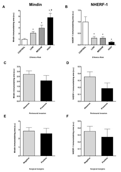 D`Amico risk classification showed that MINDIN immunolabeling was increased in tumors with high risk, followed by medium and low risk (Figure 2A). Unlike MINDIN, NHERF-1 immunolabeling was decreased in tumors with low, medium and high D`Amico risks (Figure 2B). We did not find differences in MINDIN or NHERF-1 immunolabeling regarding the presence or absence of perineural invasion (Figure 2C,D), negative or positive surgical margins (Figure 2E,F) and TNM stage or age. Additionally, tumor specimens showed upregulated expression of bone-related-factors such as osterix (control = 0.47 ± 0.14 vs. tumor = 3.52 ± 0.74 arbitrary units (a.u.)) and RANKL (control = 0.0016 ± 0.0004 vs. tumor = 0.0233 ± 0.0104 a.u.) compared to control samples. These results suggest that increased levels of MINDIN in prostate tumors are associated with a decrease in NHERF-1 immunolabeling.