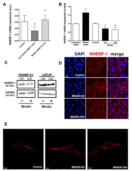 Following, we aimed to test the effects of MINDIN on the expression and subcellular localization of NHERF-1 in vitro. Stimulation with MINDIN caused a decrease in NHERF-1 mRNA and protein expression in TRAMP-C1 cells (Figure 3B,C). Similar results were observed in human adenocarcinoma LNCaP cells (Figure 3C). Moreover, silencing of MINDIN increased the expression of NHERF-1 in TRAMP-C1 cells (Figure 3B). An 85% efficiency of MINDIN silencing was corroborated by real time PCR.