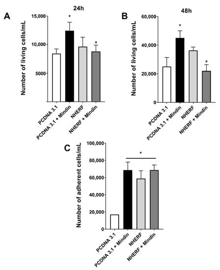 Similarly, NHERF-1 overexpression abolished the proliferative effects induced by MINDIN after 24 and 48 h of stimulation with this peptide (Figure 5A,B). However, an adhesion assay revealed that even though MINDIN induced an increase in cell adherence, NHERF-1 overexpression was inefficient inhibiting MINDIN-dependent cell adhesion (Figure 5C).