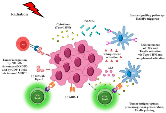 Immunomodulatory effects of radiotherapy. Local radiation to the tumor can elicit immunogenic cell death, leading to the release of cytokines and DAMPs that in turn trigger innate signaling pathways. These signals favor the recruitment of APCs such as DCs, promote uptake of dying tumor cells, and enhance the processing of TAAs and cross-presentation of antigenic-peptides, via MHC I, to CD8+ T cells. Cross-presentation of tumor-antigens can lead to the priming of tumor-specific T lymphocytes, which can then traffic back to the tumor site, infiltrate into the tumor, and potentially exert cytolytic effector activity. Radiation can also induce the release of type-I IFN from both cancer and immune cells, as well as trigger complement activation, which can reinforce both DC and T cell activation. RT can also cause upregulation of MHC I, the adhesion molecule, ICAM, and the membrane protein NKG2D type II (ligand), that ultimately enhance tumor recognition and killing by T cells and NK cells, respectively. Abbreviations. DAMPs: damage associated molecular patterns; APCs: antigen presenting cells; DCs: dendritic cells; TAAs: tumor-associated antigens; MHC I: major histocompatibility complex class I; IFN: interferon; NKG2D: natural killer group 2D; NKs: natural killer cells. Figure created with the aid of biorender.com and https://smart.servier.com/.