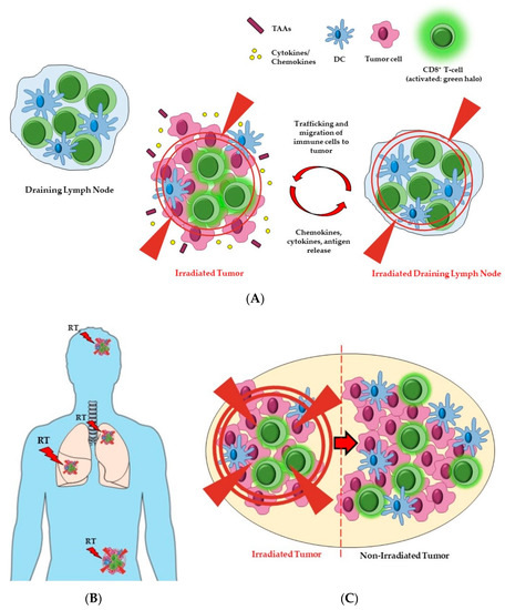The potential effects of radiation field and volume on immune responses and tumor. The size of the treatment field and the volume of the tumor irradiated can influence both local and systemic anti-cancer immune responses. (A) Including the DLNs (right side) in the radiation field could affect the balance of cytokines and chemokines which, together with the release and processing of tumor antigens, leads to trafficking and migration of immune cells (i.e., CD8+ T cells and DCs) to the tumor. Cancer cell eradication will be mediated by activated (green halo) CD8+ T cells. However, RT directed towards DLNs may also have cytotoxic effects on lymphocytes, hence impeding an effective anti-tumor immune response. (B) The irradiation of oligometastases, in addition to the primary tumor, might favor the expression or release of greater amounts and/or new tumor antigens, in a way that is proportional to the tumor burden. Multi-site RT may therefore lead to the priming and subsequent infiltration of immune cells into the different lesions (sensitization of the tumors to immune infiltration). (C) Partial tumor irradiation might be a way to indirectly control the whole tumor, by generating immune activation starting from the hemi-irradiated part. For example, activated CD T cells (shown in green) may migrate from the field of RT into the remainder of the tumor, whereby they may display anti-cancer activity in the non-irradiated part. Abbreviations. DCs: dendritic cells; TAAs: tumor-associated antigens. Figure created with the aid of biorender.com and https://smart.servier.com/.