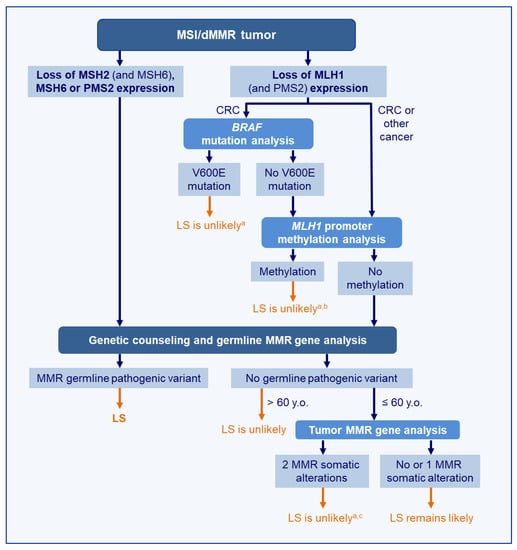 LS is mainly caused by dominant germline inactivating variations in the DNA mismatch repair (MMR) genes MLH1, MSH2, MSH6, or PMS2. As a consequence, tumors from LS patients display MSI and a loss of expression of MMR proteins. Diagnosis of LS is important, since patients with LS benefit from adapted protocols of clinical management with surveillance and more radical surgery [5,6,7]. Preventive measures include regular colonoscopic and gynecological surveillance of MMR pathogenic variant carriers, with the frequency and age of initiation dependent on the mutated MMR gene. Patients with LS may also benefit from different approaches for adjuvant therapy [8,9]. However, MSI is not restricted to LS. In fact, only 15–20% of MSI/MMR-deficient (dMMR) tumors can be attributed to LS, and most MSI/dMMR tumors are sporadic. This emphasizes the importance of distinguishing these two entities for appropriate management. This review will address the hallmarks and pitfalls of LS diagnosis. Particular emphasis will be given to the tools and optimal strategies allowing distinction of LS and sporadic MSI tumors.