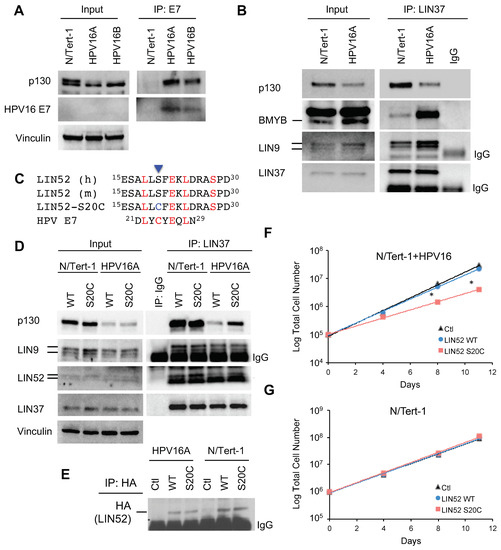 HPV16 E7 disrupts DREAM by displacing LIN52. (A). IP/WB assay shows interaction between p130 and E7 in N/Tert-1+HPV16 cell lines. (B). IP/WB analysis of DREAM and MMB complexes in N/Tert-1 cell lines. Specific bands are indicated by lines. (C). Protein sequence of LIN52 aligned with E7 LXCXE motif. Arrowhead shows residue mutated in LIN52-S20C; pS is the DYRK1A phosphorylation site. (D). IP/WB assay analysis of DREAM complex in the indicated cell lines. (E). Expression of LIN52 alleles detected using IP and WB with anti-HA antibodies. (F,G). Cell proliferation assay with indicated cell lines. * p < 0.05 (t-test) indicates significant difference with the control cell line.