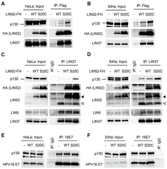 To determine whether LIN52-S20C can restore DREAM in HPV-positive cancer cells, we stably expressed WT-LIN52 or LIN52-S20C in human cervical cancer cell lines HeLa (HPV18) and SiHa (HPV16). Again, the binding of p130 to LIN52-S20C in these cells was increased compared to WT-LIN52 (Figure 3A,B). This effect was specific because both forms of LIN52 immunoprecipitated equal amount of MuvB core protein LIN37. Furthermore, expression of LIN52-S20C increased the DREAM assembly in HeLa and SiHa cells as LIN37 interacted more with p130 in the presence of LIN52 S20C, whereas the wild-type LIN52 had no effect on the p130-LIN37 interaction (Figure 3C,D). Similar amounts of LIN9 and LIN52 (both endogenous and overexpressed) were bound to LIN37, confirming the specificity of this effect. Similar to N/Tert-1+HPV16 cells, LIN52-S20C had no significant effect on p130 levels in these cells. Furthermore, the amount of p130 co-precipitated by E7 from HeLa and SiHa cells was unchanged by LIN52-S20C or the wild type LIN52 expression, indicating incomplete rescue of DREAM by LIN52-S20C (Figure 3E,F).