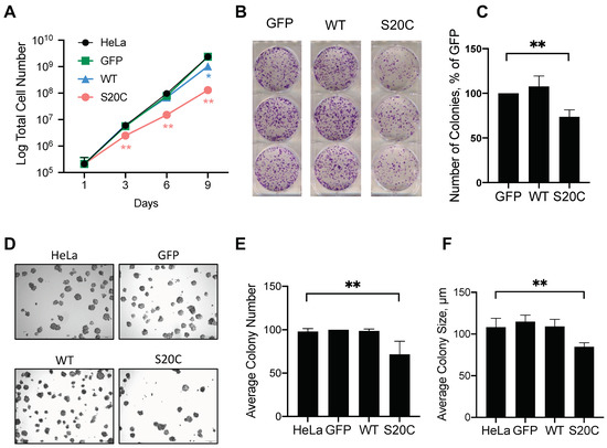 LIN52-S20C attenuates growth of HeLa cells. (A). Cell proliferation assay with indicated cell lines. * p < 0.05; ** p < 0.01 (2-tailed paired t-test for each time point) indicate significant differences with control (HeLa) cell line. (B–F). Representative images and quantification of the clonogenic assays (B,C) and anchorage-independent growth assays (D–F) with indicated HeLa cell lines. ** p < 0.01 (ANOVA with Dunnett’s multiple comparisons test) indicates significant difference between LIN52-S20C and control (HeLa) cell lines. There was no significant difference between the parental HeLa cells and either GFP-expressing or WT LIN52 HeLa cell lines (p > 0.05).