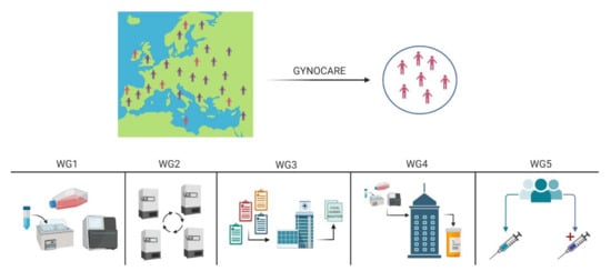 Description of the GYNOCARE COST Action CA18117. The main aim and objective of the Action is to create a European platform for Gynaecological Rare Cancer research to bridge the gap from concept to cure (connect basic research to biobanking to clinical trials). GYNOCARE has devised 5 Working Groups (WGs) and each of which contributes to a specific sub-objective and tackles a specific challenge. WG1–Basic Research: Coordination of ongoing and future research activities. The main objective of WG1 is to further develop a well-established network of researchers that impulse research in Gynaecological Cancer, with focus on very rare diseases where the treatments options are scarce. WG2–Coordination of bridging the gap between biobanks and translational research projects: The main objectives of WG2 are to establish a virtual network from the existing European biobanks for rare gynaecological malignancies (using a virtual platform that will allow the real time visualisation of the samples); and to integrate the biobanking concept within the clinical trials and translational research projects running in this field. WG3–Coordinating harmonisation of legal/regulatory requirements for international trials and other collaborative efforts. This WG aims to harmonise the legal requirements requested from the different European countries (all EU countries and non-EU countries within Europe). WG4-Bridging the gap between industry and biotechnology companies and translational research projects. The main objective of WP4 is to introduce GYNOCARE to the Pharma industries and to the companies that are developing commercial tools for diagnosis and prognostic assessment of the patients to showcase the distinct value for trial and study design, while also revealing to potential for smarter drug design and reuse of existing therapeutics. WG5–Coordination of interactions between clinical trials, translational research, and basic research. The main objective of the WP is to connect all the actions and stakeholders to existing and established clinical trial activities. (https://www.cost.eu/actions/CA18117/#tabs|Name:overview). Figure created using Biorender (https://biorender.com/).