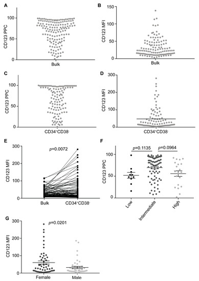 No statistically significant differences were found according to the cytogenetic risk stratification [27]. However, a clear trend towards higher CD123 expression levels was detected in the intermediate risk group (Figure 1F). Surprisingly, we also found a clear trend towards higher CD123 expression levels (MFI p = 0.00181 and PPC p = 0.0938) in female patients as compared to males when analyzing CD34+CD38− LSC (Figure 1G).