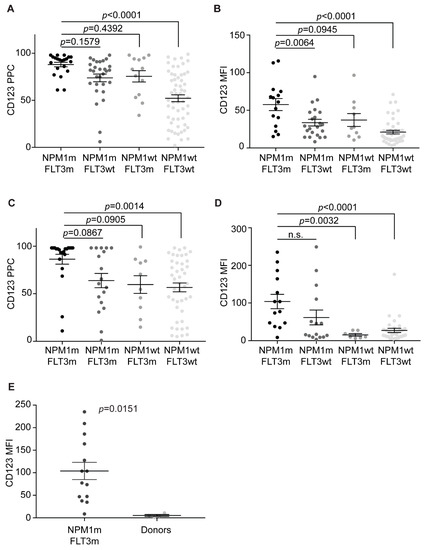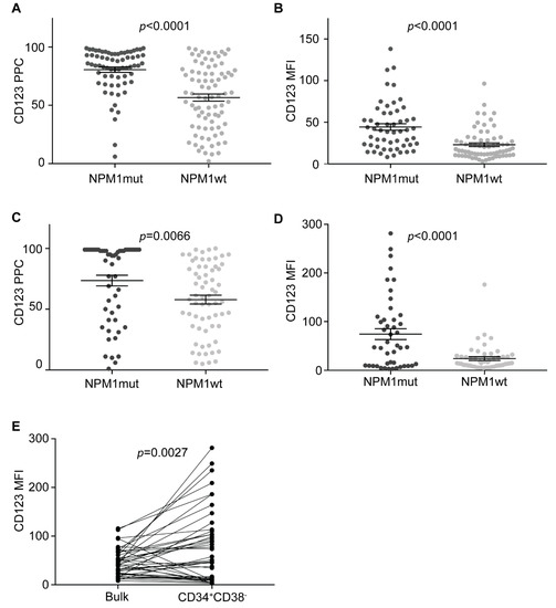 As previous xenograft experiments suggest that NPM1mut AML LSCs are CD123-positive [28], we investigated CD123 expression in NPM1mut samples. NPM1 was mutated in 68/151 patients (45%), and 97% (66/68) NPM1mut samples were CD123-positive. When compared with NPM1wt samples, NPM1mut cases displayed significantly higher CD123 expression levels on bulk AML cells (PPC and MFI p < 0.0001) (Figure 2A,B).