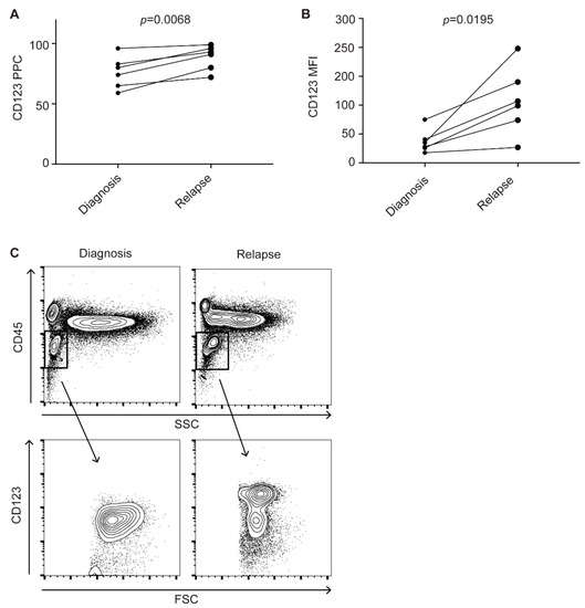 As several studies suggest that relapse frequently derives from residual LSCs after treatment [4,5], we analyzed CD123 expression on bulk AML cells in six NPM1mut patients at diagnosis and relapse. In all patients, CD123 expression increased at relapse, compared to diagnosis (PPC p = 0.0068 and MFI p = 0.0195) (Figure 3A–C). As two out of six patients had too-small numbers of CD34+CD38− cells at diagnosis (<50 events), no comparison between diagnosis and relapse was possible in this subpopulation. Nonetheless, all six samples showed very high CD123 expression levels on CD34+CD38− cell at relapse (average PPC 96 and average MFI 139). Altogether, these data confirm that CD123 is consistently expressed on NPM1mut AML putative LSCs.