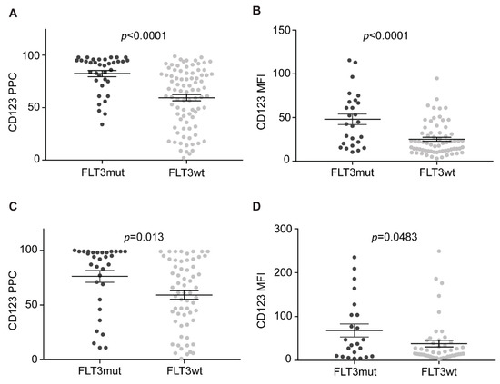 Since AML with mutated NPM1 frequently harbors FLT3 mutations, which have been previously reported to be associated with higher CD123 expression [29,30], we also analyzed the FLT3 mutational status in 122 samples. FLT3 was mutated in 46% (24/52) NPM1mut and in 19% (13/70) of NPM1wt cases. Two patients were positive for the FLT3-D835 mutation, while all others harbored FLT3-ITD. We first compared CD123 in FLT3-mutated (FLT3mut) and FLT3 wild-type (FLT3wt) samples. FLT3mut samples showed significantly higher CD123 levels than FLT3wt cases. This was true for bulk cells (PPC p < 0.0001 and MFI p < 0.0001) and, though with a lesser degree of certainty, for CD34+CD38− cells (PPC p = 0.013 and MFI p = 0.0483) (Figure 4A–D).