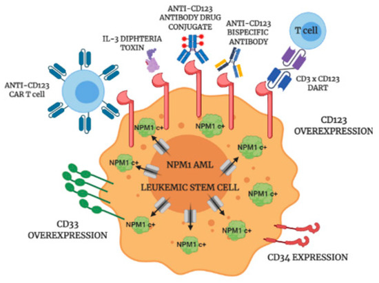 - Jin, L.; Lee, E.M.; Ramshaw, H.S.; Busfield, S.J.; Peoppl, A.G.; Wilkinson, L.; Guthridge, M.A.; Thomas, D.; Barry, E.F.; Boyd, A.; et al. Monoclonal antibody-mediated targeting of CD123, IL-3 receptor alpha chain, eliminates human acute myeloid leukemic stem cells. Cell Stem Cell 2009, 5, 31–42. [Google Scholar] [CrossRef]