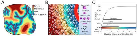 Solid tumors generally show regions with insufficient oxygen supply, defining them as hypoxic [1]. The oxygen distribution is highly heterogeneous with hypoxia levels ranging from mild, almost non-hypoxic, to severe and anoxic levels. This heterogeneity shows transient and long-term changes as the cancer develops [2], creating a dynamic pattern of hypoxia levels that induces cellular responses and controls interactions between tumor cells, stroma and immune cells in the microenvironment (Figure 1A,B). Hypoxia is an adverse factor associated with poor outcome in most cancer types and treatment modalities. The significance of various hypoxia levels for cancer treatment is well demonstrated by the higher cell kill of sparsely ionizing radiation in the presence of oxygen compared to under anoxic conditions, where a steep decrease in radiosensitivity is seen when the level changes from mild hypoxia of about 2% O2 to severe hypoxia of below 0.02% O2 (Figure 1C) [3]. In addition, individual hypoxia levels induce biological responses, like cancer cell survival and metastasis, that impair the treatment effect [4], and there is a large difference in the hypoxia level most strongly associated with poor radiotherapy outcome within and across cancer types (Figure 1C) [5]. This knowledge documents the importance of incorporating hypoxia levels in the work to understand treatment resistance mechanisms and implement new, upcoming therapeutic approaches, like immunotherapy, and radiation therapy with particles or in combination with hypoxia targeting drugs.