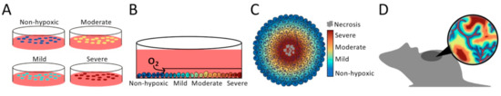 Model systems for studying hypoxia levels. (A) 2-dimensional (2D) monolayer cell cultures. Exposed to specific oxygen concentrations in a gas chamber. (B) 2D monolayer cell culture with an oxygen gradient created by a plate inserted into the petri dish at one end of the culture to limit oxygen and nutrient exchange with media. (C) Spheroid with a gradient in hypoxia levels from the periphery (non-hypoxic) towards the center (necrosis). (D) Animal model, showing a mouse with tumor grown on the back. The distribution of hypoxia levels in a section through the tumor is indicated. (A–D) hypoxia levels are indicated by the color code, with approximate oxygen concentrations (% O2) and tensions (mmHg) provided by the x-axis in Figure 1C.