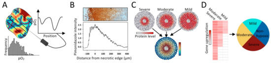 Invasive methods for quantification of hypoxia levels. (A) Polarographic needle electrodes for recording of pO2 along tracks in a tumor. Frequency distribution of recorded pO2 values is indicated. (B) Pimonidazole staining intensity in a histologic section from a xenograft tumor vs. distance from necrosis (below). The histologic section is shown above. (From “MRI Distinguishes Tumor Hypoxia Levels of Different Prognostic and Biological Significance in Cervical Cancer”. by Hillestad, T.; Hompland, T.; Fjeldbo, C.S.; Skingen, V.E.; Salberg, U.B.; Aarnes, E.-K.; Nilsen, A.; Lund, K.V.; Evensen, T.S.; Kristensen, G.B.; et al. 2020, Cancer Res., 80, 3993–4003, Copyright 2020 by American Association for Cancer Research [27]). (C) Spheroids indicating proteins upregulated at different hypoxia levels (above), and the combined expression data (below). (D) Gene expression signatures associated with defined hypoxia levels (left), and pie chart showing fractions of tumor with the defined level (right). (A,C,D) Hypoxia levels are indicated by the color code, with approximate oxygen concentrations (% O2) and tensions (mmHg) provided by the x-axis in Figure 1C.