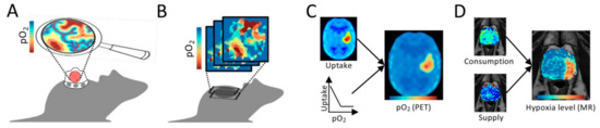 There are no established methods for medical imaging of hypoxia levels in patient tumors; however, promising experimental positron emission tomography (PET) and magnetic resonance (MR) based techniques are currently applied in clinical trials to assess hypoxia status. Although PET suffers from poor spatial resolution, with a typical voxel size of 64 mm3 for clinical scanners and 8 mm3 for preclinical micro-PET scanners [52], an important advantage of this technique is the existence of several hypoxia specific tracers. Most of them are based on nitroimidazole compounds and demonstrate similar oxygen dependent binding kinetics as pimonidazole [53]. The tracer uptake is therefore directly related to hypoxia level (Figure 4C) [54,55,56]. Frequently used nitroimidazole tracers, 18F-fluoromisonidazole (18F-FMISO) and 18F-fluoroazomycin-arabinoside (18F-FAZA), show half maximum binding at about 0.1–0.3% O2 (0.8-2.1 mmHg) in vitro [57,58,59]. This relationship between oxygen concentration and tracer uptake has been used to convert PET signal to pO2 [54], although without validation against other measures of hypoxia levels. The tracer binds intracellularly, and normalization of the signal with paired data on cell density obtained from a biopsy or MR image would be a useful approach to assess hypoxia levels.