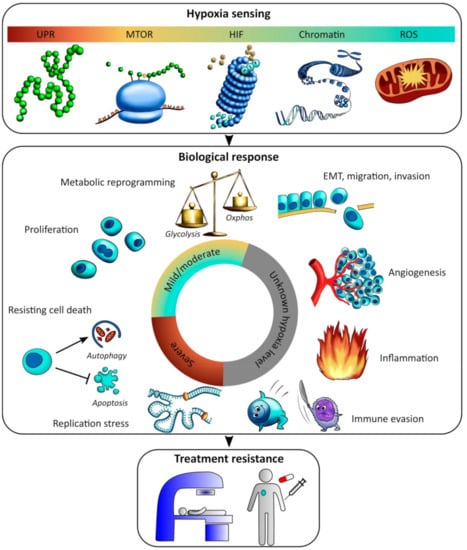 Cell function is maintained through transcriptional and translational activities, which are highly energy-consuming processes [64]. Under hypoxia, tumor cells reprogram their activity from general housekeeping functions to activation of specific pathways, aiming to conserve energy under the deprived conditions. The biological responses are initiated by several hypoxia sensing mechanisms, and determine whether the cells will survive and thus become a treatment resistant subpopulation of the tumor, or die (Figure 5).