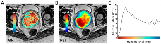 For assessment of hypoxia levels in deeper lying tumors or tumors in patients, medical imaging is particularly attractive (Figure 4). Most patients undergo comprehensive multiparametric MR and PET imaging as a part of their diagnostic procedure. These techniques can therefore rapidly be used in large scale studies without high costs or changes in the hospital’s infrastructure. Such methods will likely increase our understanding of hypoxia levels within and across patient tumors in the future. In addition, co-registering of images makes it possible to combine images of hypoxia levels on a voxel-by-voxel basis with medical images showing other biological tumor features. An example is seen in Figure 6, where an MR-based hypoxia level image of a cervix tumor, derived as described in [27], was combined with a 18F-fluorodeoxyglucose (18F-FDG)-PET image of glucose uptake. In this tumor, glucose uptake increased from mild towards more severe hypoxia, consistent with studies in cell lines [100,101], and was followed by a steep decrease at the most severe levels. The approach can be extended by using upcoming PET tracers to visualize immune responses [175] or drug uptake [176].