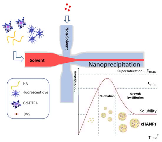 Crosslinked hyaluronic acid nanoparticles (cHANPs) co-loaded with the metal chelate Gd-DTPA and the fluorophore ATTO 488 are produced in microfluidics by nanoprecipitation through a hydrodynamic flow focusing regime in standard operative conditions as described in the method section and previously reported [29,43]. Briefly, nanoparticles are produced in a microfluidic X-junction chip where the solvent solution of HA and active agents (Gd-DTPA and ATTO 488 or ATTO 633 alternatively) is fed in the middle channel and the non-solvent solution made of acetone and DVS, in the side channels. A schematic representation of the microfluidic set-up for cHANPs production is reported in Figure 1.