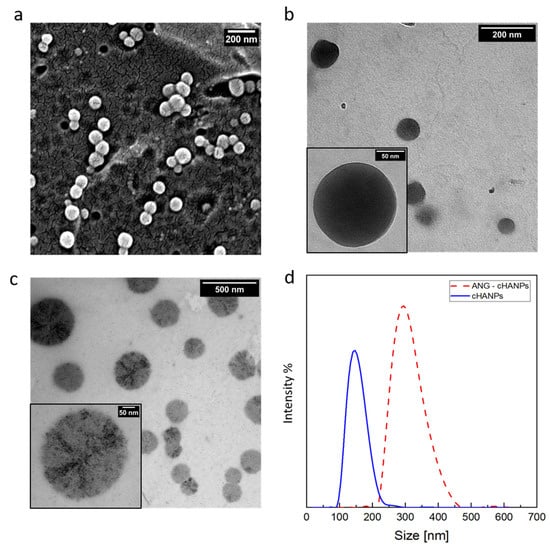 Morphological characterization of crosslinked hyaluronic acid nanoparticles (cHANPs) and angiopep-2 decorated crosslinked hyaluronic acid nanoparticles (ANG-cHANPs). (a) SEM images of cHANPs; (b) TEM image of cHANPs; (c) TEM images of ANG-cHANPs; (d) Size distributions of cHANPs and ANG-cHANPs by DLS measurements.