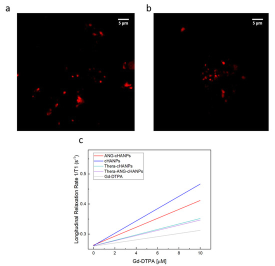 Simultaneous encapsulation of gadolinium-diethylenetriamine pentaacetic acid (Gd-DTPA) and ATTO in cHANPs and ANG-cHANPs. (a) Confocal microscopy images of cHANPs; (b) Fluorescent microscopy images of ANG-cHANPs; (c) Longitudinal relaxation rate (1/T1) in s−1 of free Gd-DTPA in water (grey line), cHANPs (blue line), and ANG-cHANPs (red line), Thera-cHANPs (cyan line); Thera-ANG-cHANPs (violet line) showing a relaxivity r1 of 3.58, 20.32, 12.08, 9.09 and 8.86 mM−1s−1 respectively.