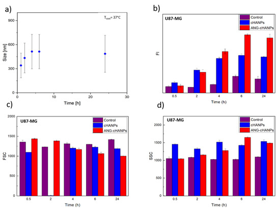 Quantitative uptake of nanoparticles by U87-MG cells in flow cytometry. (a) ANG-cHANPs stability in culture medium at 37 °C up to 24 h (b) Fluorescence intensity (FI) of U87 after incubation with cHANPs and ANG-cHANPs; (c) Forward scattering (FSC) of U87 after incubation with cHANPs and ANG-cHANPs (d) Side scattering (SSC) of U87 after incubation with cHANPs and ANG-cHANPs.