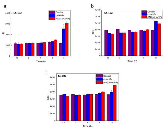 Quantitave uptake of NPs by GS-102 cells in flow cytometry. (a) Fluorescence intensity (FI) of GS-102 after incubation with cHANP and ANG-cHANPs; (b) Forward scattering (FSC) of GS-102 cells after incubation with cHANPs and ANG-cHANPs (c) Side scattering (SSC) of GS-102 cells after incubation with cHANPs and ANG-cHANPs.
