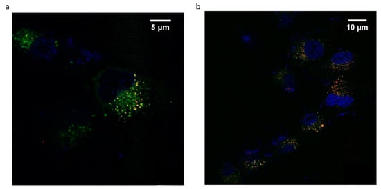 ANG-cHANPs localization in U87-MG cells is studied by confocal imaging. This study is performed with ANG-cHANPs encapsulating Gd-DTPA and ATTO 633 (EE% 10%), a NIR dye, in place of ATTO 488 in order to avoid artifacts due to the strong autofluorescence of biological samples in the visible spectrum [57]. Figure 7a,b confirm ANG-cHANPs uptake, showing time-dependent nanoparticle accumulation into cells. Both images confirm the stability of ATTO 633 loading inside nanoparticles considering the absence of diffuse fluorescence associated with free dye [55]. As previously observed by flow cytometry results reported in Figure 4b–d, Figure 7a confirms a relevant uptake of ANG-cHANPs after 4 h of incubation, also revealing a partial correlation of nanoparticles with lysosomes identified by yellow spots (the overlap of red and green fluorescence of ANG-cHANPs and lysosomes respectively). In Figure 7b after 6 h of incubation, a stronger correlation of ANG-cHANPs with lysosomes can be observed. These results perfectly match the flow cytometry results.