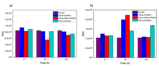 Flow cytometry measurements are performed on U87 MG cells incubated with free CPT-11, Thera-cHANPs and Thera-ANG-cHANPs at the same concentration of CPT-11 of 10 µM at different time points. The FSC measurement was used as an indication of cell viability [56,58], with the aim to assess the therapeutic potential of the nanoformulations and compare it to the free drug. As CPT-11 is a topoisomerase inhibitor acting on cell division, three time points up to 48 h were analysed to allow all the cells to complete the cell cycle. Similar to the previous experiment, the measurements of SSC were used to evaluate the amount of internalized nanoparticles, being an indication of the granularity of the cells. In this way, both the role of the nanovector itself and angiopep-2 in improving the uptake of CPT-11 can be evaluated. Figure 8a shows that starting from 24 h, the FSC both for Thera-cHANPs and Thera-ANG-cHANPs is decreased with respect to the control. In particular, the FSC of Thera-ANG-cHANPs is significantly decreased of about 35% at 24 h. The increase in FSC at 48 h may be attributed to remaining live cells that continue to replicate, with internalized NPs dividing in daughter cells causing a decrease in the amount of CPT-11 per cell. This hypothesis is supported by the significantly decreased SSC value. FSC values of free CPT-11 are higher than nanoparticles up to 48 h showing that free CPT-11 has a delayed effect with respect to nanoformulated CPT-11, which confirms improved uptake capacity of Thera-ANG-cHANPs. SSC values in Figure 8b confirm these results, which are significantly higher for Thera-cHANPs and Thera-ANG-cHANPs up to 24 h. Also in this case, free CPT-11 reaches the highest internalization only at 48 h. Both FSC and SSC confirm the improved uptake of nanoformulated CPT-11 which is significantly faster with respect to free drug. This effect is particularly evident for Thera-ANG-cHANPs.