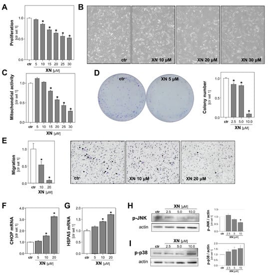 To identify the mechanism through which XN was exhibiting its functional effects on melanoma cells, we analyzed its effects on the expression of markers of endoplasmic reticulum (ER) stress. Previous studies have shown that XN induced ER-stress in leukemia and breast cancer cells [,], and a recent study by Zhang et al. found that ER-stress mediated XN-induced cell death in a murine melanoma cell line []. Interestingly, we also observed that in the subtoxic range: XN dose-dependently induced the expression of the ER stress markers CCAAT-enhancer-binding protein homologous protein (CHOP) and heat shock protein family A (Hsp70) member 5 (HSPA5; also known as binding immunoglobulin protein (BiP)) in both human melanoma cell lines (Figure 2F,G, Figure S2F,G). Furthermore, we analyzed the effects of XN on the phosphorylation of c-Jun N-terminal kinases (JNK) and found that XN inhibited the JNK-phosphorylation in the subtoxic range (Figure 2H, Figure S2H). Importantly, this mitogen-activated protein kinase (MAPK) has been shown to be a critical promotor of different aspects of the tumorigenicity of melanoma cells []. In contrast, phosphorylation of p38 MAPK was slightly induced following treatment with XN (Figure 2I, Figure S2I). Interestingly, a study by Mi et al. indicated that XN-induced cell death of leukemia cells is mediated by the p38 MAPK signaling pathway []. The role of p38 in apoptosis of melanoma cells is controversial, and opposing pro- and anti-tumorigenic effects have been described [].