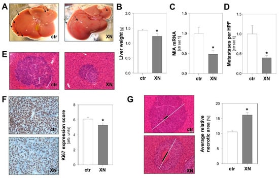 To test the effect of XN on tumor metastasis in vivo, we employed an established syngeneic murine model of hepatic metastasis [,]. Murine B16-F10 melanoma cells were injected into the spleen of syngeneic Bl/6N mice with and without XN treatment. XN was applied via intraperitoneally implanted pellets releasing XN continuously over time with a daily dose of 10 mg/kg body weight []. Control mice received vehicle-containing placebo pellets. Macroscopic analysis showed less metastases on the liver surface of XN-treated mice (Figure 3A). Similar to what was observed in previous studies [], metastases appeared in part as whitish, a sign of depigmentation. Interestingly, a recent study found that loss of melanin pigmentation enhances the ability of melanoma cells to spread in vivo []. Here, we observed that liver weight was significantly lower in XN-treated mice reflecting reduced hepatic tumor burden (Figure 3B). Tumor load was also quantified by analysis of melanoma cell-specific MIA expression in hepatic tissues. This gene is specifically expressed in melanoma cells but not in liver tissue [,]. Quantitative RT-PCR analysis revealed significantly lower MIA mRNA levels in livers of XN-treated animals reflecting reduced hepatic tumor load (Figure 3C). In line with this, histological analysis showed fewer and smaller metastases in XN-treated mice (Figure 3D,E). Immunohistological analysis revealed significantly reduced Ki67 staining in metastases formed in XN-treated mice, indicative of reduced mitotic activity of melanoma cells in these tumors (Figure 3F). Furthermore, XN treatment resulted in significantly larger areas of central necrosis in hepatic metastases (Figure 3G). In summary, these data demonstrate that XN significantly reduced hepatic metastasis of melanoma cells in vivo.