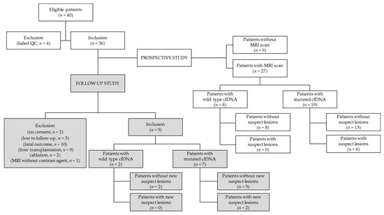 Hepatocellular carcinoma (HCC) is the third leading cause of cancer-related death globally [1,2,3,4] with a 5-year survival rate lower than 10% [5]. The high mortality rate is mainly due to the underlying liver disease and especially at a late diagnosis, when curative treatment can no longer be offered. If patients are detected with early stage HCC, several curative treatment options are available, including surgical resection, transplantation and microinterventional therapy, which can increase the 5-year survival rate up to 70% [6]. Liver cirrhosis (LC) is the underlying preneoplastic condition in 90% of patients with HCC in the western world [7]. The cirrhotic liver takes several steps in its progression to HCC by evolving from a chronic inflammatory-fibrotic stage, through low-grade and high-grade dysplastic nodules, eventually leading to neoplasia. The sequence of events offers the opportunity to capture the neoplastic development at an early stage and has been translated into current clinical recommendation of screening and surveillance for HCC. In patients with LC, standard screening/surveillance based on ultrasound (US) and alpha-fetoprotein (AFP) is suboptimal, because it is lacking in sensitivity and specificity [4,8]. Magnetic resonance imaging (MRI) represents the gold standard in the diagnosis of HCC, however, due to the operating costs, its use in clinical practice is mostly reserved for patients with suspect lesions. Furthermore, MRI has its limitation in detecting malignant lesions with a diameter less than 10 mm [7,9] with accepted imaging criteria for the diagnosis of HCC (wash in and wash out) being characterized by a high specificity (close to 100%) but low sensitivity (around 70%). Therefore, mainly precursors or early forms of HCC are missed through these criteria. Supporting evidence for detection and characterization of HCC in its earlier stages through multiparametric MRI is growing, therefore the need for novel biomarkers to identify patients with LC who are at higher risk for developing HCC is urgent. Circulating cell-free DNA (cfDNA) is released in blood as a consequence of cellular apoptosis or necrosis. Although detectable at a low concentration in healthy individuals, cfDNA is found in significantly higher concentrations in patients with chronic inflammatory or malignant diseases [10,11]. cfDNA has gained considerable attention as a novel tumor biomarker: kinetic analysis [12,13] and molecular profiling [14] have demonstrated both a predictive and prognostic value in different types of malignancies [15,16,17,18]. Detectable cfDNA in a considerable amount has been reported in HCC patients, and in patients with LC [19,20,21,22]. The potential for the analysis of cfDNA variants carried by cirrhotic patients may indicate abnormal changes towards a malignant development at a stage when HCC is not yet recognizable by standard imaging. We recently performed a mutation profiling of cfDNA isolated from advanced HCC patients and identified a panel of 19 genes carrying defined mutations suggesting a possible role as driver genes and prognostic markers [23]. In this exploratory prospective cohort study, we performed mutation profiling of cfDNA isolated from LC patients without HCC according to US and AFP. The molecular profiles were compared with the findings in the multiparametric MRI imaging using hepatocyte specific contrast media. In addition, we present selected case reports to demonstrate how liquid biopsy can support imaging analysis. The aim of this study was to unravel a prognostic significance of cfDNA with respect to the LC progress.
