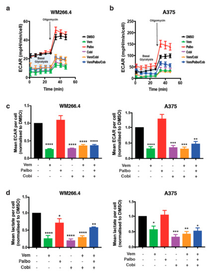 Palbociclib treatment has no substantial effect on the glycolytic phenotype of vemurafenib and cobimetinib. Extracellular acidification rate (ECAR) was determined using Seahorse Extracellular Flux analysis in WM266.4 (a) and A375 (b) cells, treated for 72 h as indicated with palbociclib (palbo; 1 M), vemurafenib (Vem; 300 nM), cobimetinib (cobi; 10 nM) or their combination. Representative ECAR profiles are shown (from 3 independent experiments). (c) Basal ECAR in WM266.4 and A375 cells treated for 72 h as indicated. (d) Lactate production per cell in WM266.4 and A375 cells treated for 72 h as indicated. Data are normalised to cell number and expressed as fold change relative to DMSO controls. Error bars SEM, n = 3. Statistical significance was determined by one-way ANOVA: * p = 0.05–0.01, ** p = 0.01–0.001, *** p = 0.001–0.0001, **** p < 0.0001.